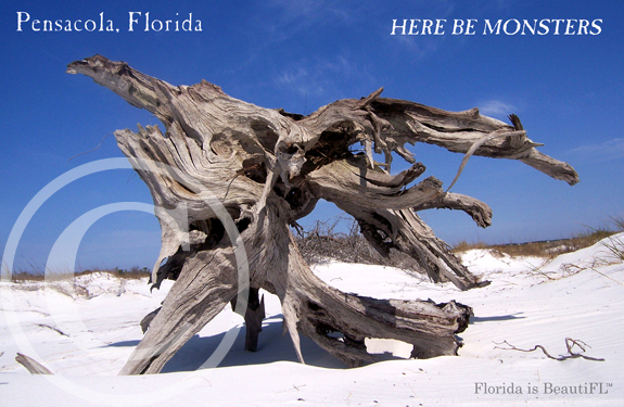 warning to those who would dare the waters of Pensacola Beach: HERE BE MONSTERS.Hammered by hurricanes for half a millenium, Pensacola always blooms through centuries of rubble and ruin. If you’ve seen to a prettier place, let us know. It’s awesome.