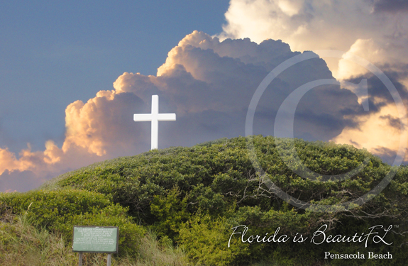 The Gulf Winds use the sea oats to write their songs in the sand. Come listen. Every sunset in Pensacola is heavenly. Come see. The sign says, “This marker commemorates the first religious service in the Pensacola area,